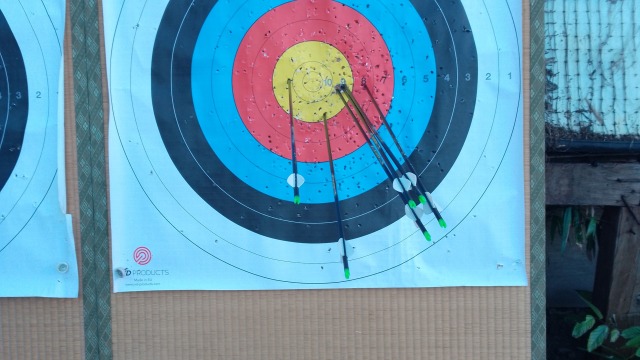 今日は今年最後の練習でしたが、寝不足だったのでダラダラ練習しました。いつかいてませんが、距離は30m、リカーブ用の的、ベアボウで練習しています。「今日はすべて8以上に入るまで帰れません」ルールで練習しました。細かいズレは左右のブレは押しての...