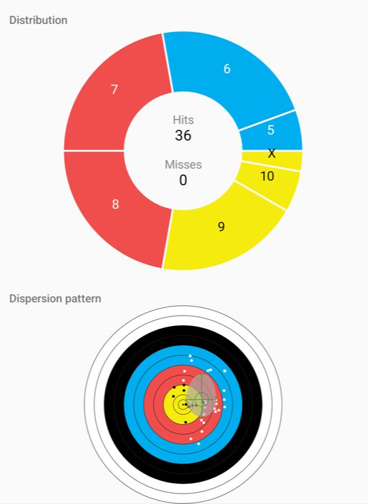 右寄り。打ち方に問題があるが、矢はまっすぐ飛んでいる気がする。若干右寄りな気もするが…