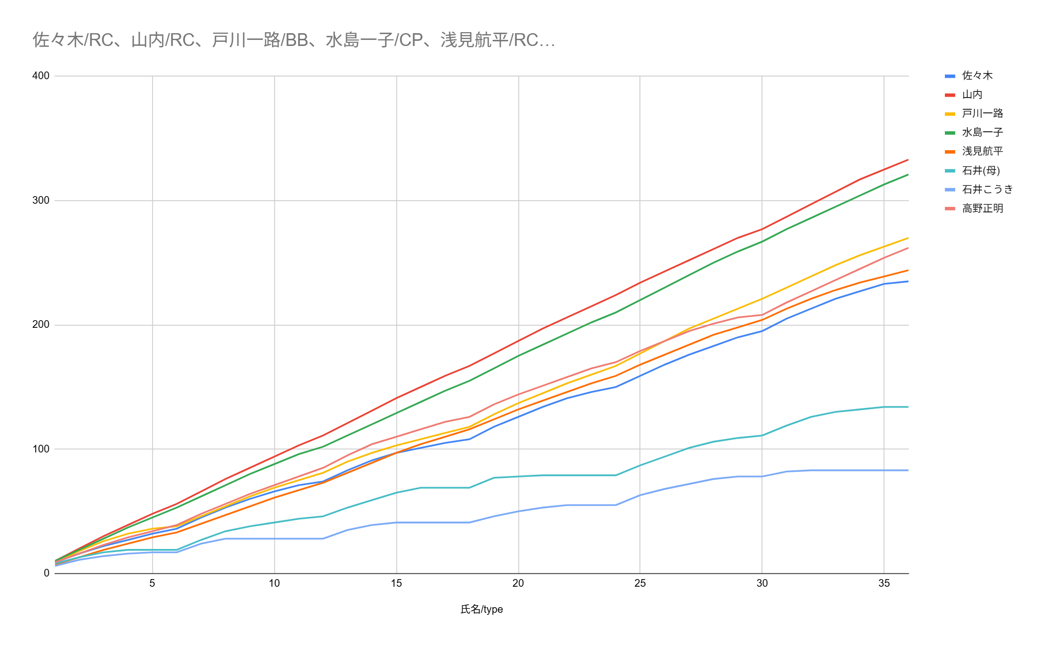 | 山内 | RC | 30 | 1 | 1 | 10 | 10 | 10 | 9 | 9 | 8 | 56 | 56 |